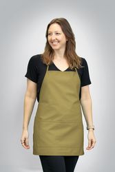 Exclusive, Eco Bib Apron. Made in the USA with artisan/ vintage inspired colored recycled polyester fabric, made from Polyethylene Terephthalate (PET) Bottles used for drinking and soda packaging. The recycled PET bottle delivers a soft, luxurious, colorfast product without depleting the Earth's natural resources. Material: Recycled Polyester, made from Polyethylene Terephthalate (PET) & Organic Cotton. 65% Recycled Poly & 35% Organic Cotton. Size: 26" x 30",5/8" binding, adjustable neck & 40" waist ties. Colors: Black, Avocado, Silver, Charcoal, Khaki & Denim. *Decoration available upon request